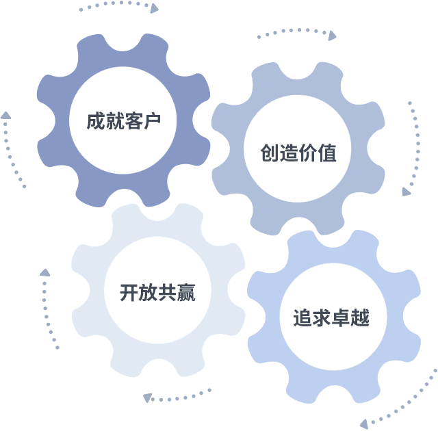 成就客户是一切决策的出发点,,创造价值是衡量所有工作的标准,,,追求卓越是我们做事做人的态度,,开放共赢是我们的格局也是最终的结果。。。价值观的齿轮环环相扣,,,推动着组织里的每个人不断向前。。
