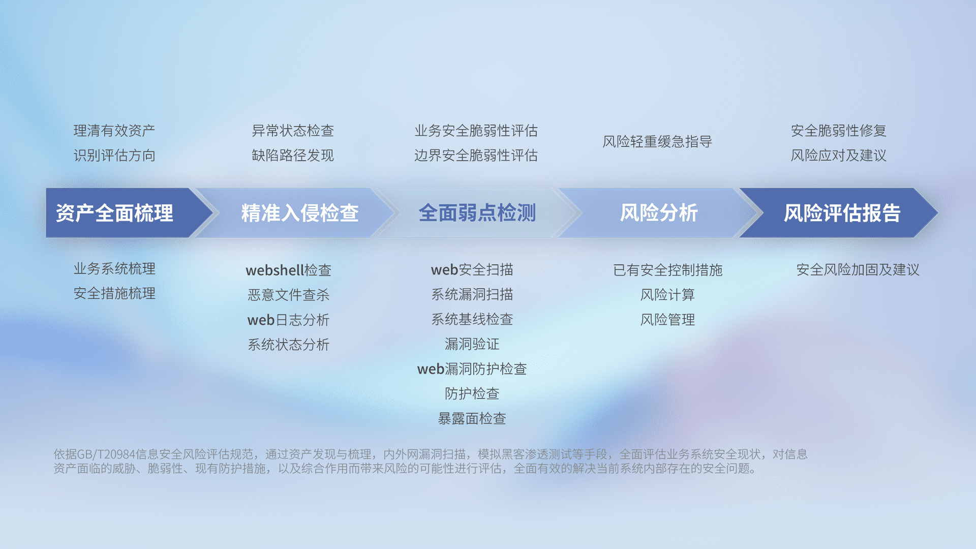 针对客户行业特性,,,,以专业的安全服务+多厂商联合解决方案提供专属的一站式安全管理服务,,,,帮助客户全面感知网络空间威胁,,,,基于识别、、、检测、、、分析、、、、防护、、、、监测、、、响应的服务理论模型,,,从方案咨询、、、集成交付、、、、评估验证、、、、优化加固、、、运维运营,,,,致力于为客户提供完整的闭环管理式安全服务。。。。以实战经验为客户打造高抵御风险的安全体系,,帮助客户发现威胁、、、对抗威胁、、、处置威胁,,,,不断积累安全对抗能力,,,持续保障数字化安全。。